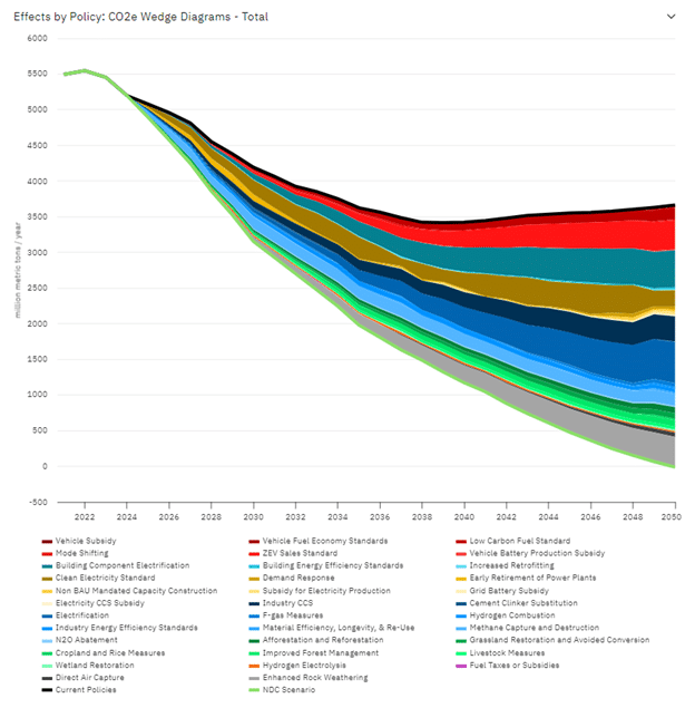 - Breakdowns of how each policy within a policy package contributes to total abatement and the cost-effectiveness of each policy (e.g., wedge diagrams and cost curves).