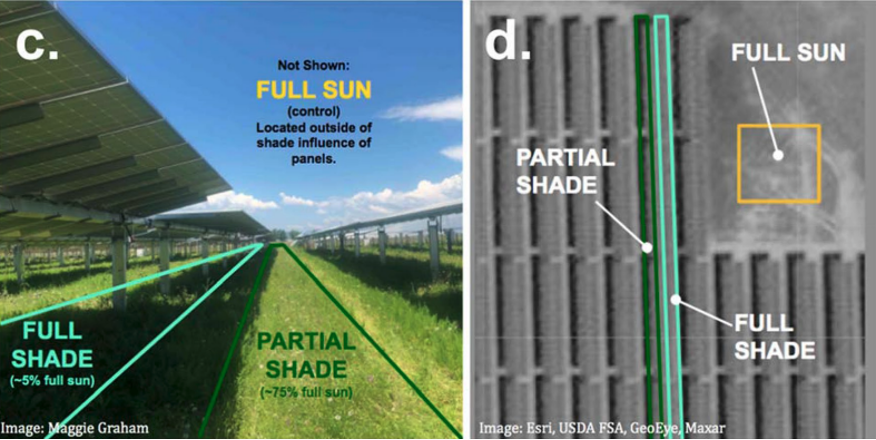 Relative to PV with crops or PV with pasture, the most widely deployed form of dual-use PV in the United States to date is called “pollinator-friendly PV.” This type of agrivoltaic strategy installs solar arrays on top of pollinator habitat, which according to the National Renewable Energy Laboratory (NREL) is already utilized in more than 1 gigawatt of U.S. PV installations. A field study by Graham and colleagues published earlier this year in Nature Scientific Reports compared the composition and behavior of foraging pollinators between fully and partially shaded plots under solar arrays and on full-sun (control) plots at the Eagle Point Solar Plant in southwestern Oregon (Figure 4). Although the fully shaded areas directly beneath the panels attracted far fewer pollinating insects, the researchers observed more types and greater numbers of insects in the partial-shade plots, relative to the full-sun plots, at certain times throughout the growing season. Although pollinators were observed to actually visit plants at comparable rates between each of the treatment areas, some plants in the partial shade plots bloomed later, which the authors suggested could benefit late-season pollinators.