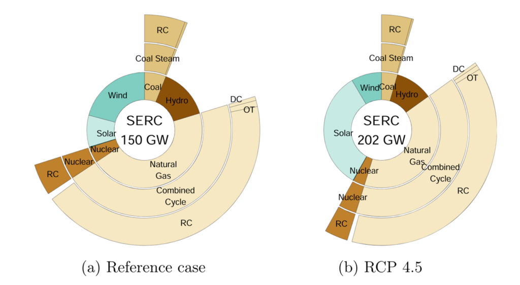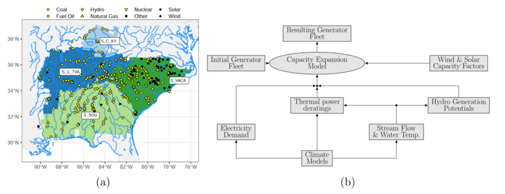 In this study, Fonseca and 10 co-authors evaluate planning for capacity expansion in the U.S. Southeast in 2050. They use a series of models to explore energy mixes that include coal, hydropower, nuclear, solar, natural gas, and wind in the future relative to today. Their multi-model framework captures climate change impacts of an ensemble of future climate change projections. The suite of simulation models they use includes 20 global climate models downscaled, run through hydrologic, streamflow routing, water management, and water temperature models in order to translate global-scale changes to local temperature, precipitation, and streamflow impacts. Streamflows and temperatures from these scenarios are then used to evaluate both hydro generation potentials and thermal power deratings, capturing changes in operation characteristics including power plant efficiency, available power capacity, and water use intensity. The same climate scenarios also drive an electricity demand model. Collectively, this modeling suite provides inputs to the capacity expansion model used to evaluate future energy mixes (outlined in Figure 1b).