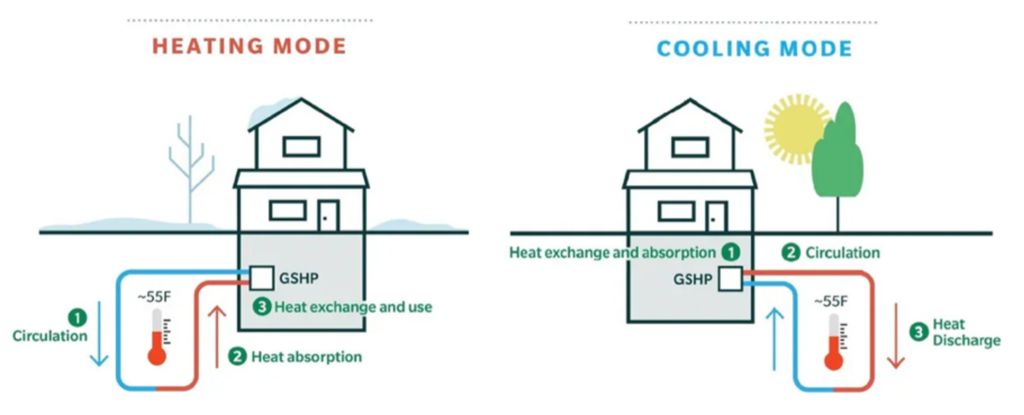 Figure 2. The “geo-grid” works by (1) installing a series of ground-source heat pumps at homes and businesses; (2) allowing these heat pumps to tap into pipes that carry a mixture of water and antifreeze; and (3) circulating the water-antifreeze mixture in boreholes drilled about 500 feet below the surface (so-called shallow geothermal), where the temperature stays at a fairly constant 50° to 60°F all year. Circulating the fluid below the surface allows the fluid to reach a consistent temperate temperature, around 55°F, which improves the system’s efficiency. At the surface, an electric heat pump uses the temperate fluid to warm buildings during the winter and to cool buildings during the summer. Source: Eversource, “Geothermal Pilot Program for Eastern Massachusetts” (2022), https://www.eversource.com/content/ema-c/business/save-money-energy/clean-energy-options/geothermal-pilot-program.