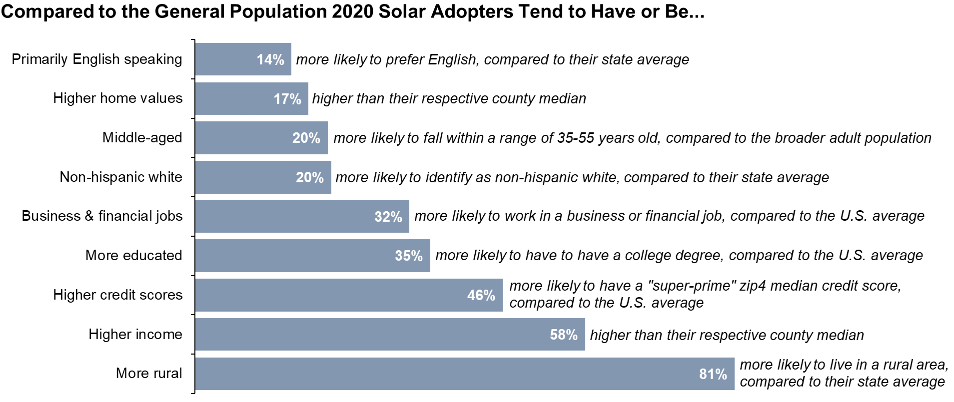 Although improving, the solar equity gap remains significant. A 2022 study by Barbose et al. found that in 2020, solar adopters typically identified as non-Hispanic white, were primarily English-speaking, had higher education levels, and lived in rural areas, in higher-value homes, and in neighborhoods with higher average credit scores, as Figure 1 below shows.