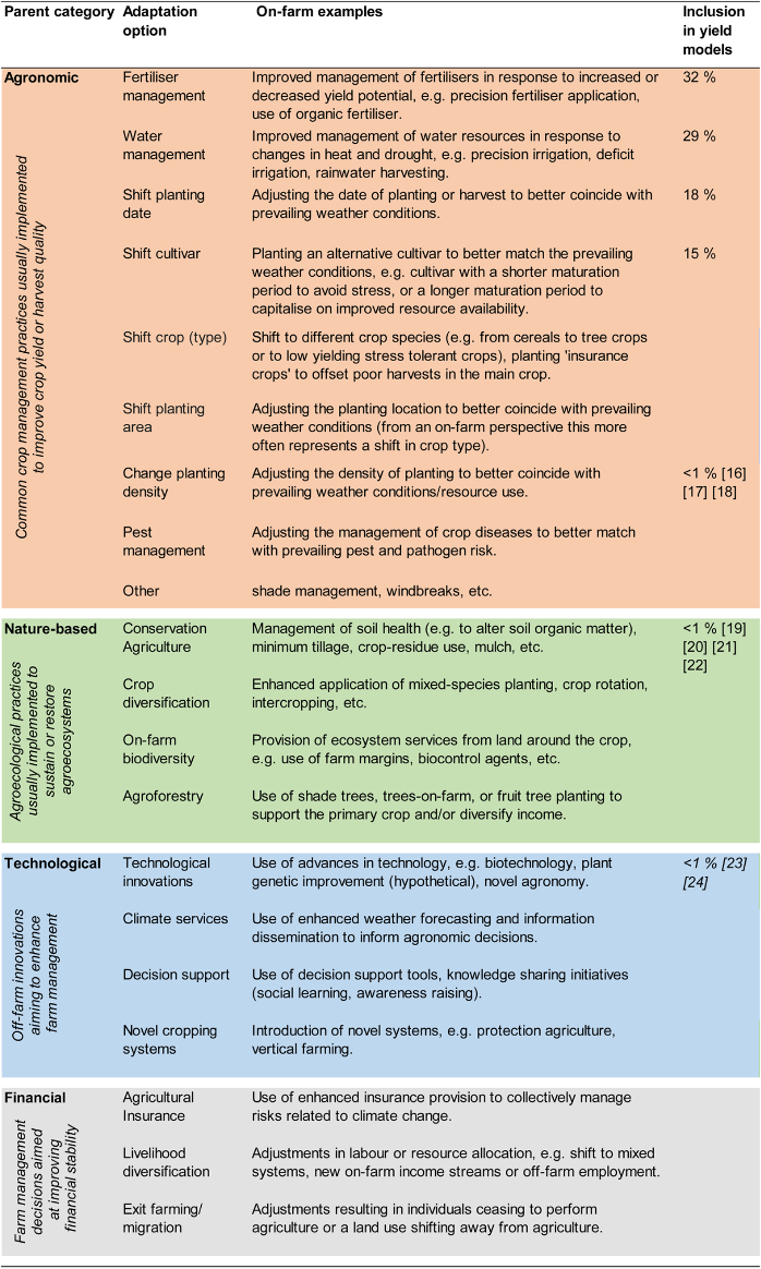 Farrell and colleagues found that crop yield models can represent a few adaptations, like improved fertilizer and water management or planting timelines relatively well, but the vast majority of adaptation options available to farmers are not included in models sufficiently, if at all (see Table 1). In large part, this is because many agricultural models are process driven and require large volumes of data to represent detailed biophysical climate processes and factors that affect crop yields, such as photosynthesis rates; soil, water, and nutrient dynamics; heat and water stress; evapotranspiration; and CO2 effects.