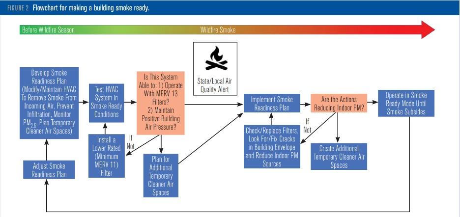 Based on this information, several communities have implemented portable air cleaner loan programs during fire season. In northern California, the Bay Area Air District has partnered with the Public Health Institute to provide over 3,000 portable air filtration units to low-income residents diagnosed with poorly controlled asthma. The American Society of Heating, Refrigerating and Air-Conditioning Engineers (ASHRAE) has also developed Guideline 44P to provide HVAC and building measures to minimize occupant exposures during wildfire smoke events (Figure 2).