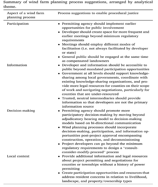 Procedural justice captures the idea of fair process. In a fair process, the perception of how someone is treated can often be more important than the outcomes of the process. The authors use four themes of procedural justice—participation, information, decision-making, and local context—to map fairness in wind planning. Participation refers to who is included, when they are engaged in the process, and how the process is structured. Information refers to timeliness and accessibility of information around a project, as well as the knowledge gaps that may exist if information is obscured or neglected by powerful actors. The themes of both participation and information overlap in their recognition of the need for a neutral intermediary between stakeholders to broker interactions and information. The authors characterize fair decision-making as dynamic and adaptive, where engagement continues beyond the planning phase to address emergent concerns. Finally, context represents the importance of place, local history, and the meanings and connections to all of the experiences embodied in a community enmeshed with its landscape.