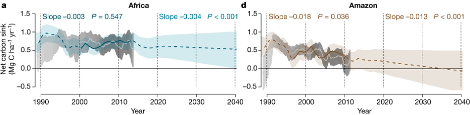 Hubau, W., Lewis, S.L., Phillips, O.L., Affum-Baffoe, K., Beeckman, H., Cuní-Sanchez, A., Daniels, A.K., Ewango, C.E., Fauset, S., Mukinzi, J.M. and Sheil, D., 2020. Asynchronous carbon sink saturation in African and Amazonian tropical forests. Nature, 579(7797), pp.80-87.
