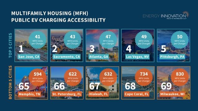 EV sales are growing at a record pace and automakers are releasing more models spanning different price points. Combined with incentives from the Inflation Reduction Act, it’s never been easier to switch to an EV. But what if you live in a multifamily house or apartment, without easy access to home charging? New Energy Innovation research finds nearly one-third of U.S. households live in a multifamily unit, making those drivers largely reliant on public charging should they make the switch. In cities without robust public charging infrastructure, this barrier can prove too high, slowing the zero-emission vehicle transition and making it harder to hit our climate goals. It also limits consumer choice, solely on the basis of home type. Up to 94 percent of U.S. EV drivers in detached, single-family homes have access to home charging, versus half of those living in apartments. This analysis ranks the best and worst cities for EV drivers living in multifamily housing and offers policy recommendations for improvement.