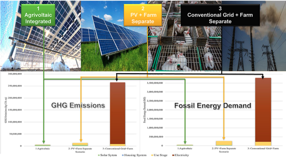 A related study explored the opportunities of shifting conventional animal feeding operations and conventional PV farms to pasture-based arrangements that integrate PV. In Cleaner and Responsible Consumption, Pascaris and colleagues explored this potential using life cycle analysis on different scenarios of rabbit and electricity production (as shown in Figure 3). When comparing emissions from the energy utilized to mow grass in conventional PV farms and supply processed feed for conventional rabbit farms, the authors estimated substantial reductions in emissions by converting to an agrivoltaic configuration. In the agrigvoltaic scenario, rabbits fed on natural grass, eliminating the need for additional feedstock or mowing operations, resulting in sizable emissions reductions gains.