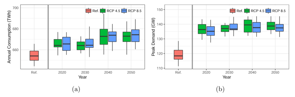 The study takes place in the SERC Reliability Corporation (SERC) region, one of North American Electric Reliability Cooperation’s subregions, located in the southeastern United States (Figure 1a). In this region, Fonseca and co-authors find that by mid-century, simulated future climate change increases annual electricity consumption by three percent (Figure 2a) and annual peak demand by 16 percent (Figure 2b), when compared to the reference case. The peak demand changes represent a shift to summer peaks, as opposed to peaks that occurred in both winter and summer. Of note, this demand evaluation focuses only on demand changes driven by climate change; other factors such as population growth are held constant at 2015 levels.