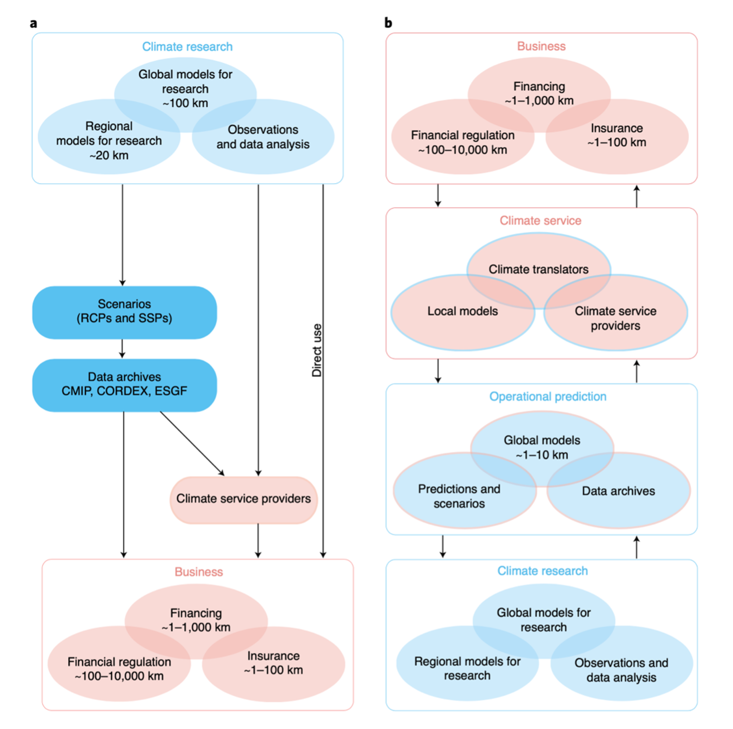 As an alternative, Figure 1b illustrates how climate projections could be professionalized to inform business needs. Using both “climate service” and “operational prediction” intermediaries would provide mechanisms to facilitate the flow of information in both directions, as indicated by up and down arrows and the mixing of pink and blue at the boundaries.