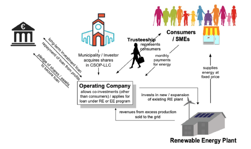 Hoicka et al. as well as Hanke & Lowitzsch both emphasize that opting for an alternate model, such as a trustee scheme (Figure 1), can lessen the burden of upfront investment and facilitate entry for low-income households. In a trustee scheme, an intermediary (the trustee) secures a loan for the acquisition of infrastructure, which can be paid off upfront (for those who are financially able) or in monthly payments (in lieu of monthly energy bills). In this structure, the trustee must act in the interest of the household shareholders, and votes are weighted by percentage of ownership (RED II governance models already require that no REC shareholder owns more than 33 percent of assets). Van Bommel & Höffken caution that this approach can depart from a more egalitarian voting structure, but that low-income households benefit immensely from having an intermediary serve as a knowledgeable advocate through the process, as well as from lower upfront investments.
