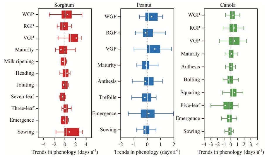 Zhang and Liu grouped phenophases into growth periods for three cash crops: a) the whole growth period from when a seed is planted through its maturation into a harvestable crop; b) the vegetative growth period of the plant before it reaches the reproductive stage; and c) the reproductive growth period, including flowering, pollination, and development of a seed, nut, or fruit. The influence of climate change on phenological shift varies across the different crops (see Figure 2). The maturity date was delayed for sorghum and canola, while it advanced for peanuts. Adaptive management strategies can offset the effects of climate change positively in each crop at different stages.