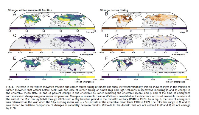 They found that warmer future climate scenarios were associated with thinner and less widespread snowpack by the year 2100, although changes to snowpack were not evenly distributed across the hemisphere. This decline in snowpack was in turn associated with a decrease in the number of days with freezing temperatures, leading to a shorter snow season. Additionally, Weider et al. found a shift in timing, with more runoff and peak streamflow earlier in the calendar year and a greater percentage of snow melt occurring before the peak snow water equivalent (SWE) for previous decades (Figure 2). These timing changes create challenges for water management.