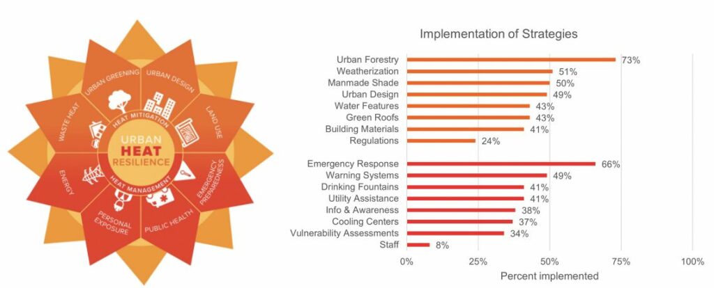 Their efforts have inspired an urban heat resilience framework that includes a set of local actions that cities can take to mitigate and manage heat (see Figure 4, left). Meerow and Keith also recently conducted a nationwide survey of planning professionals to understand what efforts are already underway (see Figure 4, right).