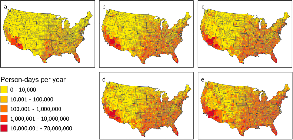 In the past, only the counties home to Miami, Phoenix, and Houston have experienced high levels of extreme heat exposure for outdoor workers (i.e., 10 million+ person-days/year). This analysis finds that in the future, 10 to 14 counties will experience similar levels. Ultimately, assuming no change in population, the researchers find that workers’ exposure to days with a heat index above 100ºF would increase three to four times by mid-century and four to seven times by late century, depending on emissions (Figure 2).