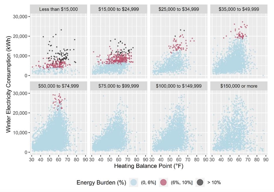 Huang and colleagues calculated the percentage of the study households living in these conditions totaled a whopping 24 percent of the study population, the majority of whom would not have been captured by traditional energy burden metrics. Because these households had so severely limited their electricity consumption, their costs wouldn’t have exceeded the traditional threshold of “low energy burden” (less than 6 percent income spent on energy).