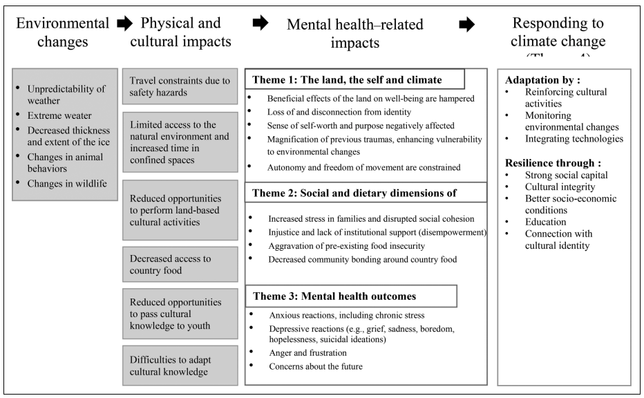 Lebel, L., Paquin, V., Kenny, T.A., Fletcher, C., Nadeau, L., Chachamovich, E. and Lemire, M., 2022. Climate change and Indigenous mental health in the Circumpolar North: A systematic review to inform clinical practice. Transcultural Psychiatry, p.13634615211066698.